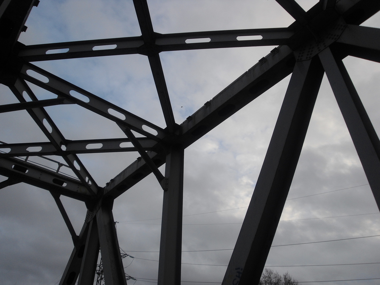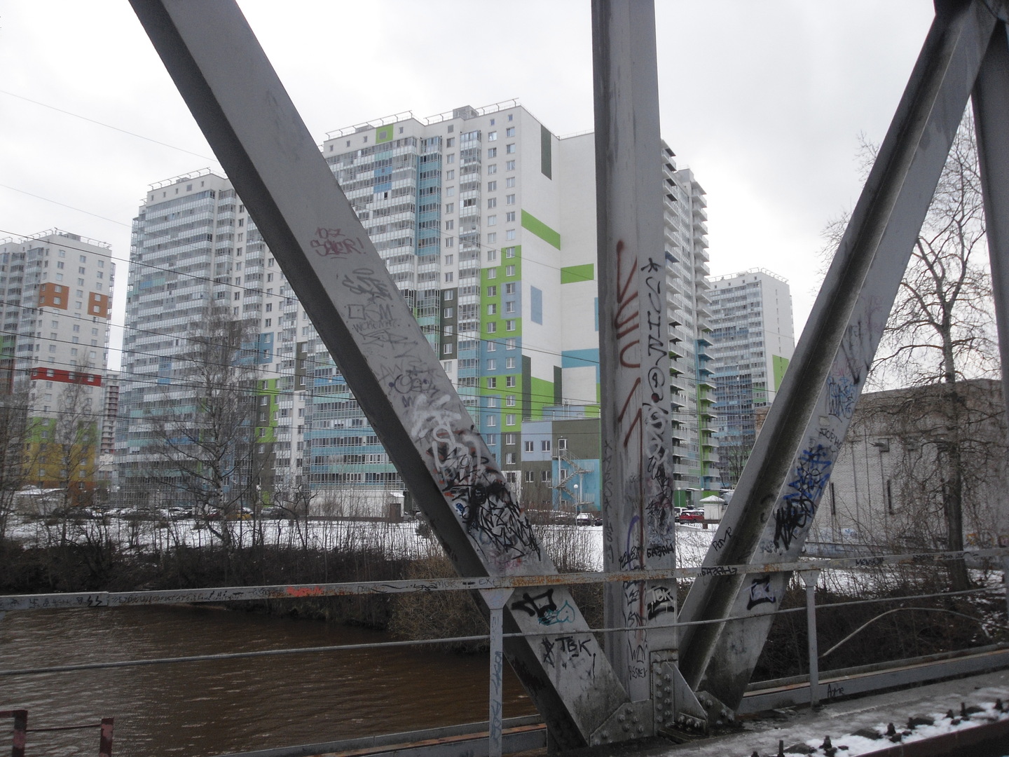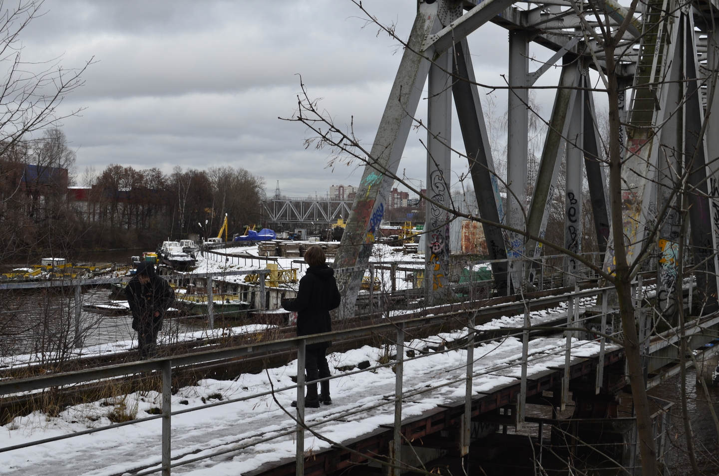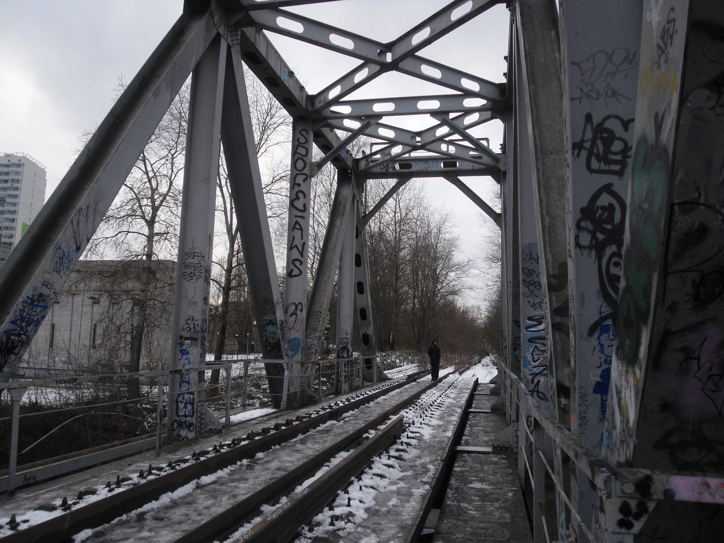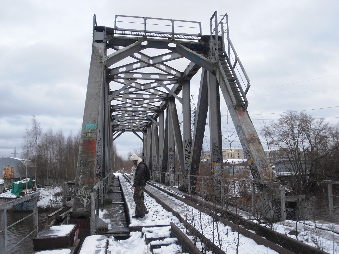 Отсюда уже можно увидеть два жд моста: один тот, что находится прямо передо мной, а второй — вдали. Оба моста идентичны по своей конструкции, они серые, по ним проложены рельсы, но передо мной заброшенный мост и жд путь тоже. Я вижу, как этот вход в пограничное пространство отмечен граффити и тегами, наклейками и другими надписями. На этом мосте находились 2 мальчика, которые просто слонялись вокруг и исследовали местность.