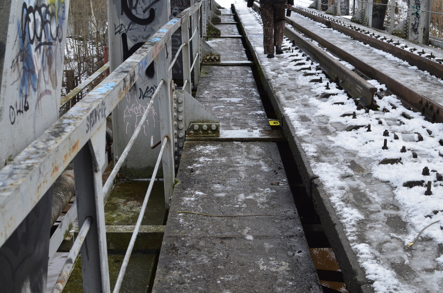 Проходя по мосту, я испытываю смешанные чувства: во-первых, восторг от находки, во-вторых, небольшую дрожь, ведь под ногами видны щели, сквозь которые проглядывается река, а сам мост не используется минимум 5 лет.