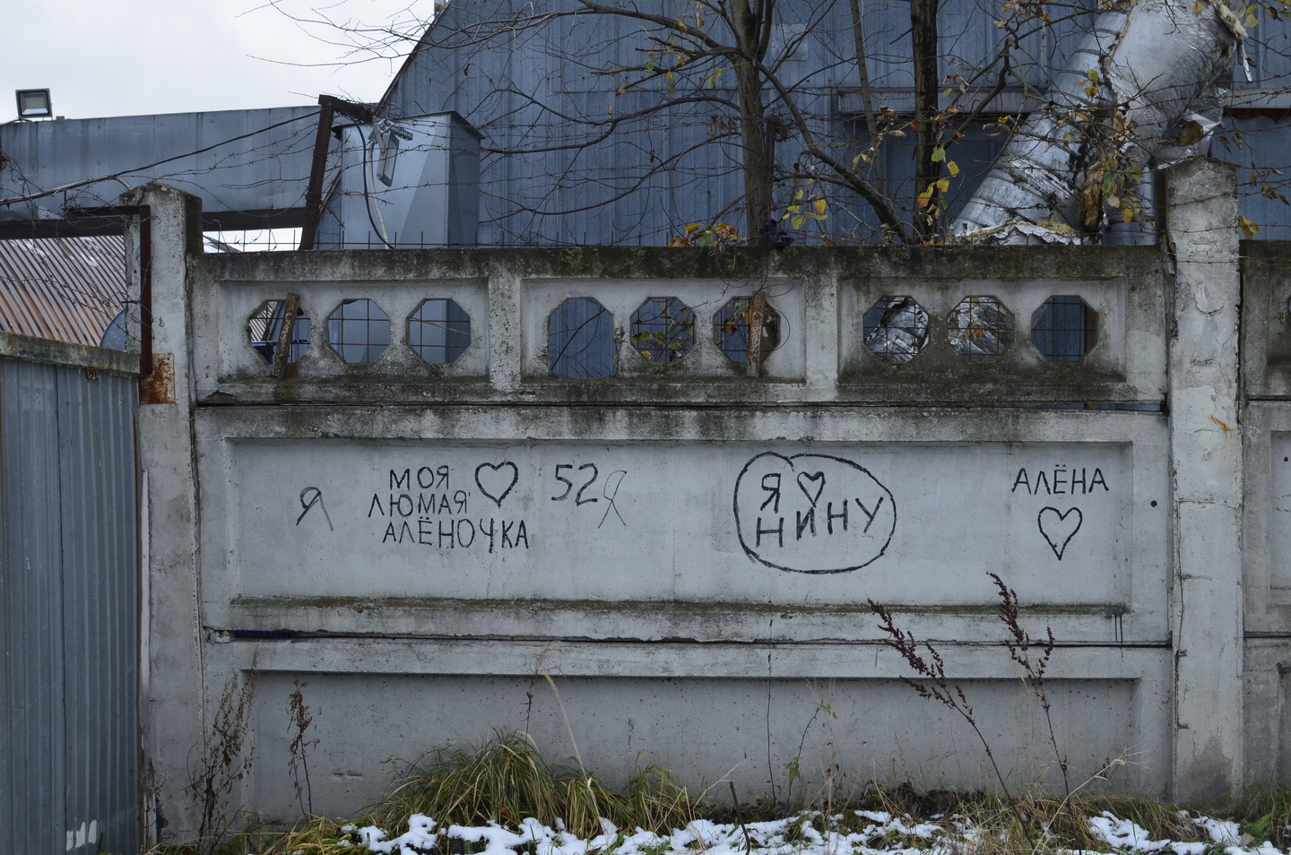 Фотография забора с надписями «моя любимая Аленочка (сердечко), я (сердечко) Нину, Алена (сердечко)» демонстрирует, что городские пустоты отличаются от безличных «не-мест» тем, что их стены обретают голос. Здесь люди находят свободу для самовыражения, оставляя интимные послания, пока их никто не видит.