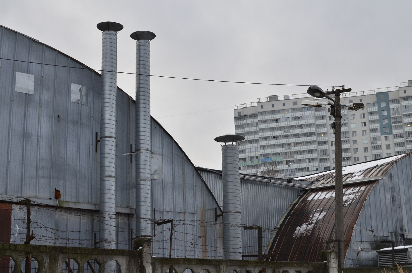 Эта композиция произвела на меня наибольшее впечатление: металлические дымоходы, арочные ангары, забор с проволокой и старый фонарь — всё это на фоне многоэтажного здания. Здесь пересекаются городские урбанистические пейзажи с «уставшими» промышленными зонами, обеспечивающими жизнедеятельность и комфорт города.