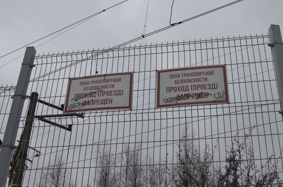 За ограждением начинается зона «камеры наблюдения», а рельсы уходят дальше, к Ладожскому вокзалу.