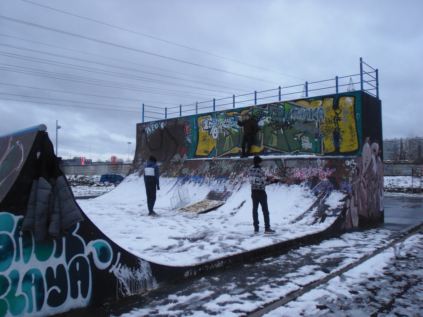 Впереди я увидела небольшой скейтпарк, где трое парней активно проводили время, забравшись на рамы, покрытые снегом. Это место, несмотря на заброшенность или сезонность, явно служило для них импровизированной игровой площадкой, приспособленной под их нужды.