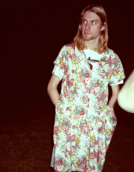 В 1990-х годах Курт Кобейн намеренно подрывал маскулинность в стиле гранж, надевая платья на фотосессии и выступления, что олицетворяло панк-идеал, отвергающий ожидания общества и преподносящий гендерное несоответствие как бунт против установленных правил, а не как эстетическое экспериментирование.[2]
