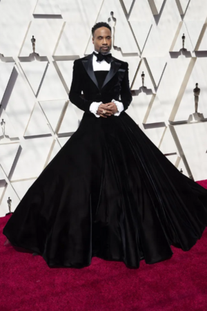 Стратегия взаиморазрушающего и в то же время взаимодополняющего сочетания содержит в себе традиционно маскулинные физические признаки с женственной одеждой, создавая эстетическое напряжение, подчёркивающее сконструированную природу гендера. Смокинг Билли Портера на церемонии вручения премии «Оскар» в 2019 году прекрасно иллюстрирует это: классический пиджак-смокинг с галстуком-бабочкой сверху и эффектное бальное платье снизу, создающие гибрид, который невозможно отнести ни к одной из категорий. Такой тандем выполняет множество функций — делает трансгрессию заметной и в то же время обеспечивает доверие к маскулинности, показывая, что женственность дополняет мужественность, а не заменяет её.