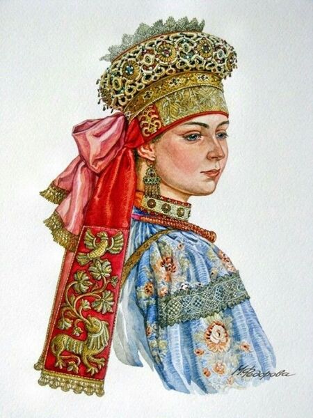 Головные уборы: Сложные конструкции вроде повойника и кокошника, предназначенные для демонстрации достатка и статуса.