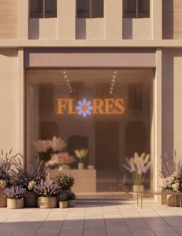 Generate image: a European flower shop building against an urban backdrop, minimalist colors and background, warm shades of beige and lavender, a contemporary style. The «FLORES» logo is written on the building’s main window. The background is blurred. The image should be more realistic, with objects close to the window. These could be flowers or urban objects.