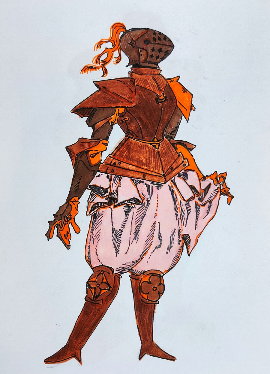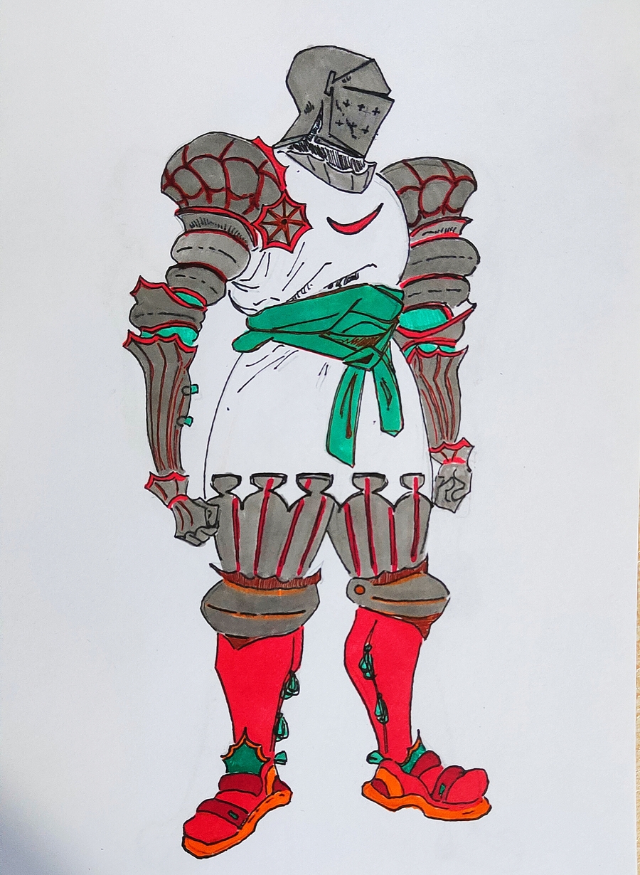 Мой творческий проект заключается в том, что я сделала небольшую серию иллюстраций с рыцарскими доспехами, исполненными в стиле известных брендов. По моей задумке знаковые логотипы и узнаваемые коды брендов должны необычно сочетаться с образом воина в полном вооружении.