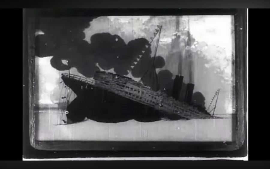 Фильм: The Sinking of the Lusitania («Гибель Луизианы», 1918, реж. Уинзор Маккей) Серия кадров показывает корабль, уходящийт под воду.