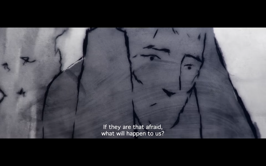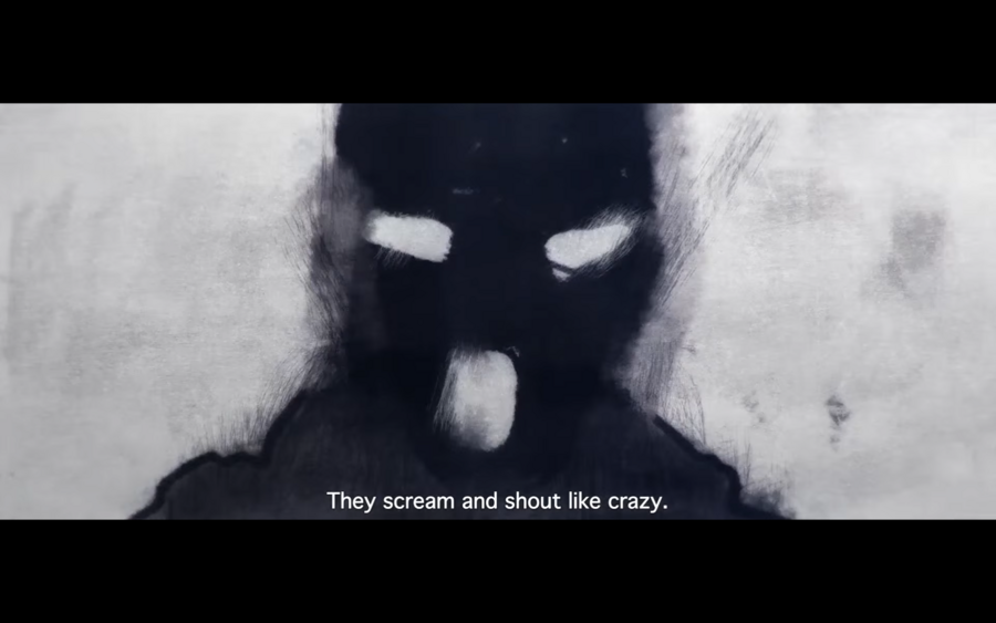Но когда протагонист касается глубоко травмирующих его воспоминаний, стиль анимации радикально меняется: реальность размываются, как и вода, превращаясь в абстрактные угольные штрихи. Такой визуальный прием показывает, что страх расщепляет воспоминания. Чёткие контуры личности исчезают, оставляя лишь зыбкие, текучие образы. Вода стала метафорой постепенного распада сознания под нагнетающим давлением невыносимого опыта, символизируя временную утрату целостности своего «Я».