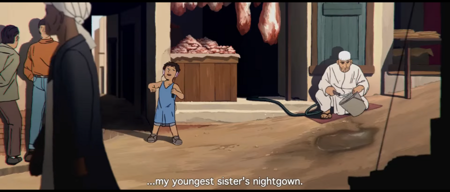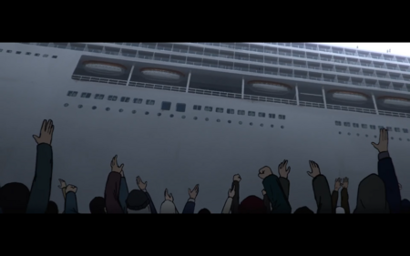 Сцена встречи с гигантским круизным лайнером демонстрирует масштаб личной трагедии для безразличного общества через соотношение объектов. Крошечная лодка на фоне громадного борта и бескрайнего океана визуализирует ничтожность отдельной судьбы в потоке глобальных изменений. Анимация намеренно гиперболизирует размеры, превращая воду и корабль в равнодушных монстров, подчеркивая экзистенциальное одиночество героев посреди водной пустыни.