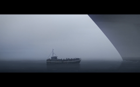 Фильм: Flee («Побег», 2021, реж. Йонас Поэр Расмуссен) Кадр, где тёмное море занимает большую часть кадра, подавляя лодку с беженцами.