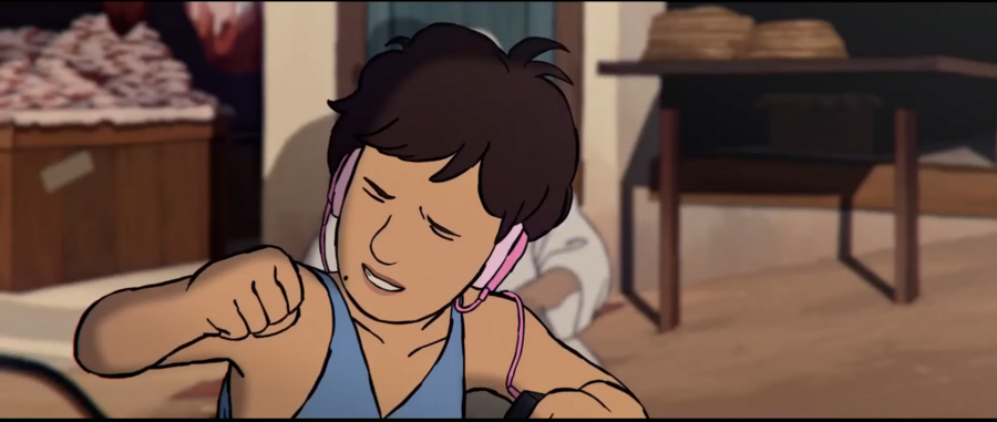 Цвета воды и техника ротоскопирования создают эффект вязкости. Тела в кадре тоже неестественны: движутся с замедлением, словно преодолевая сопротивление. Это отражает искажённое восприятие времени свойственное травмированному: вода же символизирует застревание в прошлом, которое и само не отпускает увязшего в былом. Вода становится непрозрачной ловушкой, где реальность размывается и движения героя подчинены лишь инерции, превращая плавание в бесконечный сон.