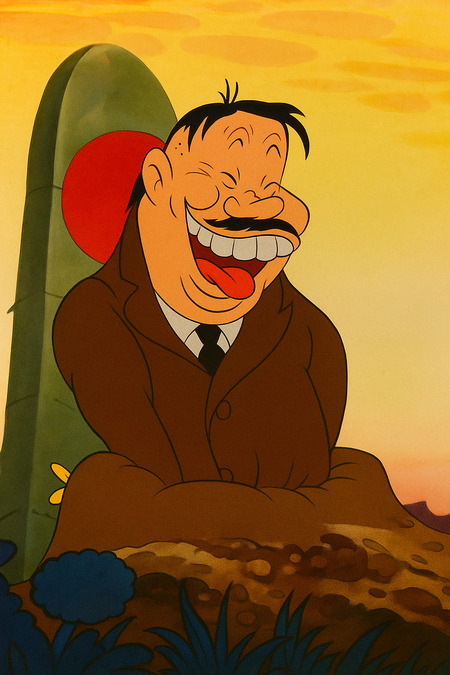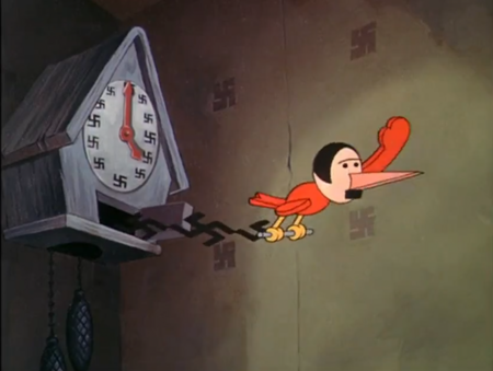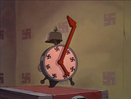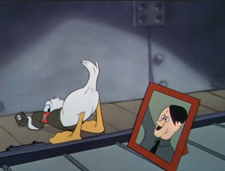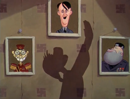 Образ нацистской Германии строился на тактике «политического высмеивания». Здесь фокус смещался с расы на идеологию. Высмеивали политических лидеров врага, лишая их ореола непобедимости и величия. Аниматоры превращали ключевые фигуры Третьего рейха в максимально карикатурных, истеричных персонажей. Главной целью было психологическое разоружение: снять страх перед противником через смех и показать его лидеров сборищем неадекватных, жалких и глупых клоунов.