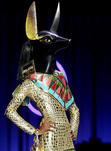 На фотографиях сравнение наряда модели и изображения Анубиса — бог-проводник в загробный мир. Он обладает человеческим телом и головой шакала. Этот элемент мы видим на модели.