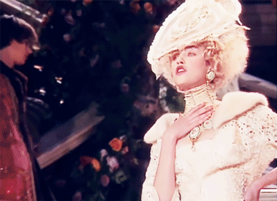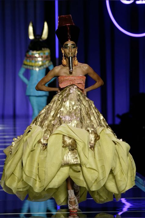 В интерпретации Гальяно образ царицы выглядит так. Статус и величие подчеркивается не только накладной бородой, но и роскошным золотым платьем, буквально кричащим о высоком положении. Головной убор имеет гиперболизированную удлиненную форму и практически идентичен референсу.