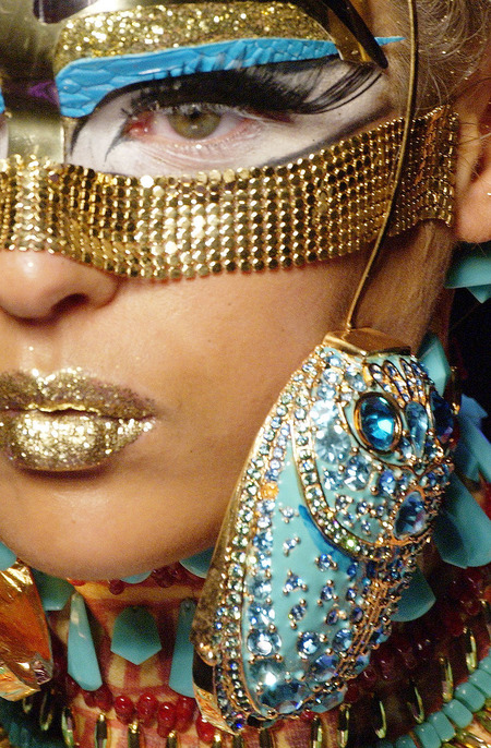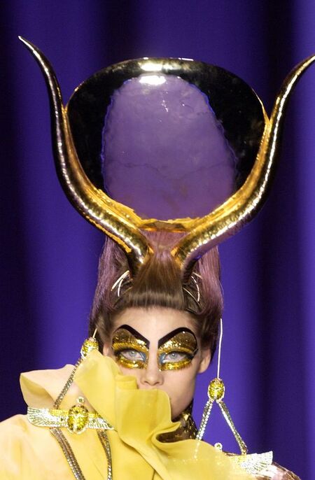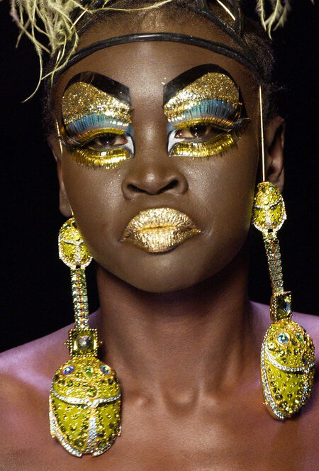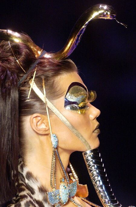 Слева — статуя богини Хатхор в Луксорском Храме. Стилизую модель под облик богини, Гальяно использовал другой подход. На манекенщице мы видим головной убор, который похож на тот, что представлен на музейном экспонате. Однако, это не точная копия, как на примерах выше. Богиню также часто изображали с крыльями. Этот образ мы можем видеть на серёжках.