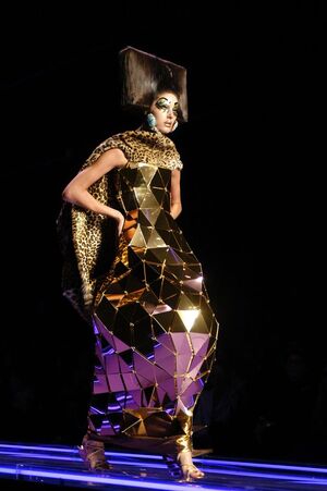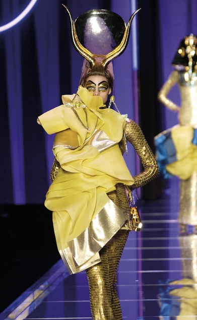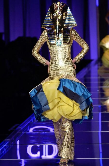 Данный наряд совмещает одеяние прошлого — царский головной убор, украшенный золотом, а также элемент современной одежды — простую белую майку. В образе также прослеживаются символы древнеегипетской живописи. Они изображены на прозрачной водолазке и выглядят так, будто у модели татуировки.