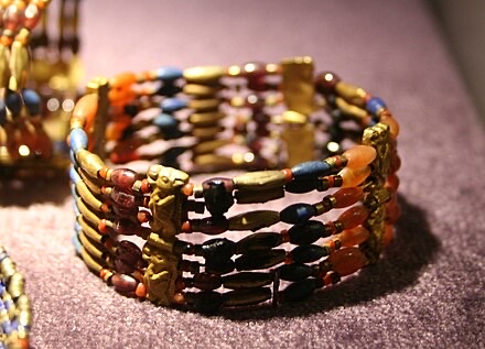 Слева: Браслет из Фив. XVIII династия. Музей Рёмера и Пелицеуса. Справа: детали платья из коллекции. Камни, использованные для вышивки, имитируют древние украшения.