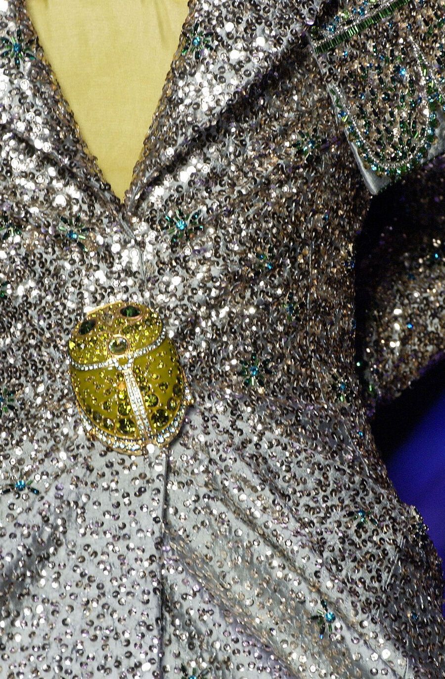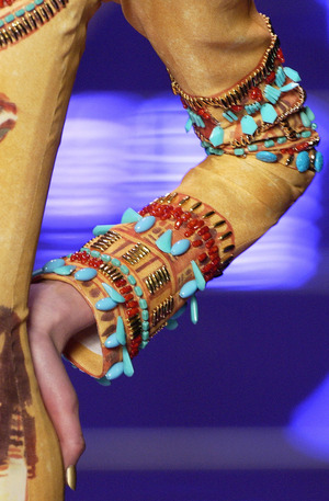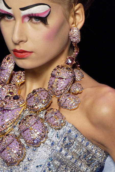 На многих моделях можно увидеть украшения в форме священного талисмана — жука-скарабея. В исполнении Гальяно это акцентное ювелирное изделие, украшенное множеством драгоценных камней.