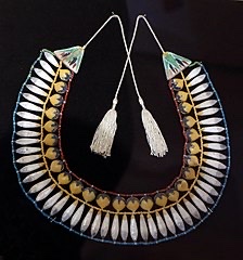 Справа: детали на платье из коллекции. Слева: Фаянсовое ожерелье XVIII династии, ок. 1325 год до н. э. Лейденский музей. Вышивка на наряде напоминает древнеегипетское ожерелье.