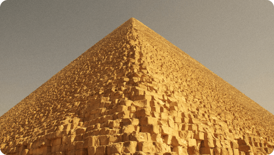 На наряде слева: золотые зеркальные элементы. Они визуально напоминают пирамиды — ещё один важный символ древнеегипетской культуры. Справа: изображение пирамиды Хеопса.
