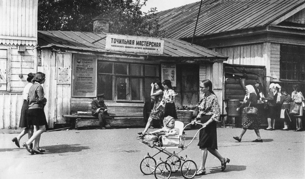 Точильная мастерская на Зелёном базаре, 1975 / Колхозный рынок, местные бабушки, 1976