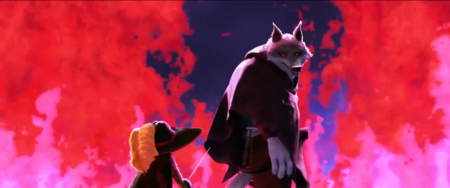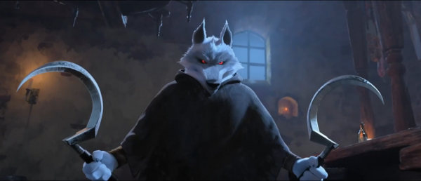 Изначально Кот в сапогах принимает Волка за охотника за головами, однако даже такой интерпретации хватает, чтобы напугать бесстрашного героя. В первой схватке антагонист одерживает победу, тем самым вынуждая главного героя осознать свою уязвимость, что и подталкивает Кота отправиться к Звезде Желаний, с помощью которой он намеревается вернуть утраченные жизни.