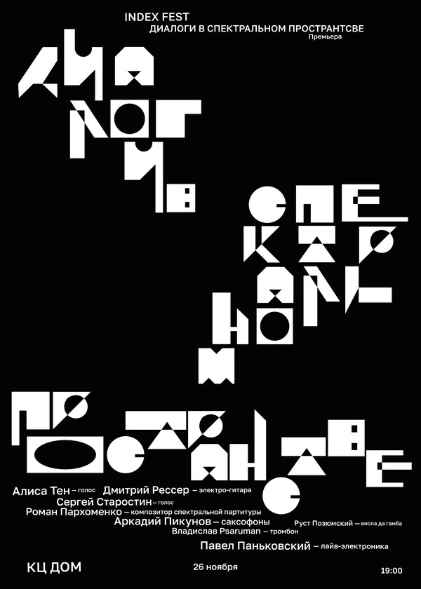 INDEX FEST — это восемь контрастных концертов новой музыки в премьерных коллаборациях. Фестиваль затрагивает такие стили как дарк-джаз, экспериментальная электроника, электроакустический перформанс, минимализм, арт-рок, фолк, дарк-техно, эмбиент и другие.