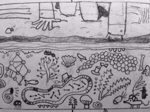 Эскиз не декоративен, а выразителен, она старается сохранить текстурность изображения с помощью комбинации штрихов разных направлений и линий, что дает ощущение детского творчества, и это работает как рваная мысль или эмоциональная вспышка