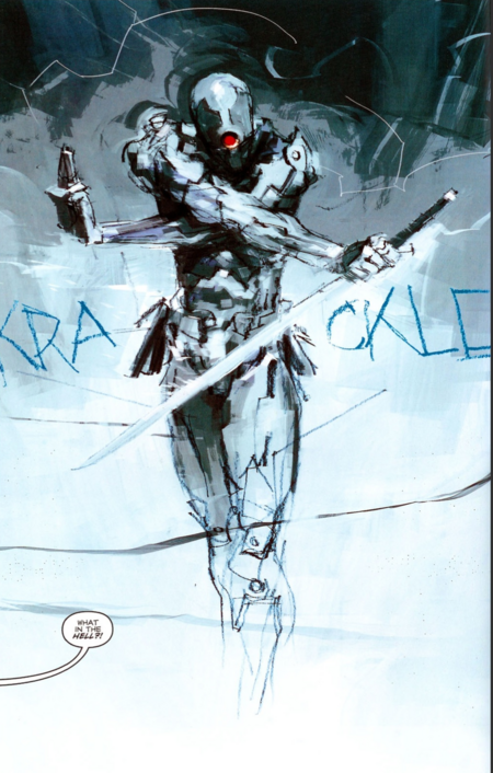 В «Metal Gear Solid» главный герой сталкивается с киборгом — модифицированным человеком, практически «сросшимся» с высокотехнологичным экзоскелетом. Будучи антагонистом, киборг часто становится ключевой фигурой на странице, а высокая проработанность металлической оболочки выделяет его на фоне множества людей и даже главного героя, чье лицо часто намеренно обозначено лишь контрастами.