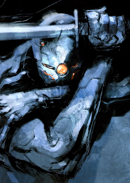 Внушительность угловатых и массивных форм и внимательный подход художника к конструированию техники видно в изображении роботов из «Зомби против Роботов», которые выглядят чище, но этим и бездушнее, умиротвореннее, чем зомби. Такая же матера прослеживается и в изображение футуристичной ядерной машины из «Metal Gear Solid», прямо противопоставленной всему человечеству.