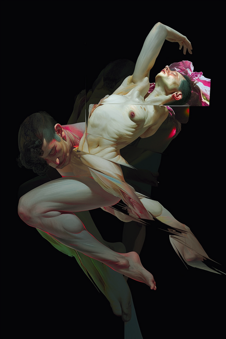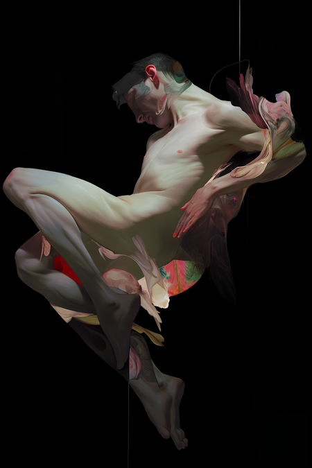 Уже несколько лет Ринат исследует феномен человеческого тела в визуальной коммуникации, и эта экспозиция — результат самостоятельных исследований разных точек зрения на данный феномен и попытка создать собственную антологию понятий и художественных образов. На нескольких экранах галереи разворачивается видеоинсталляция с превращением тела из природного в техногенное, где ренессансная телесность деконструируется, теряет плоть и обрастает цифровыми и технологичными смыслами.