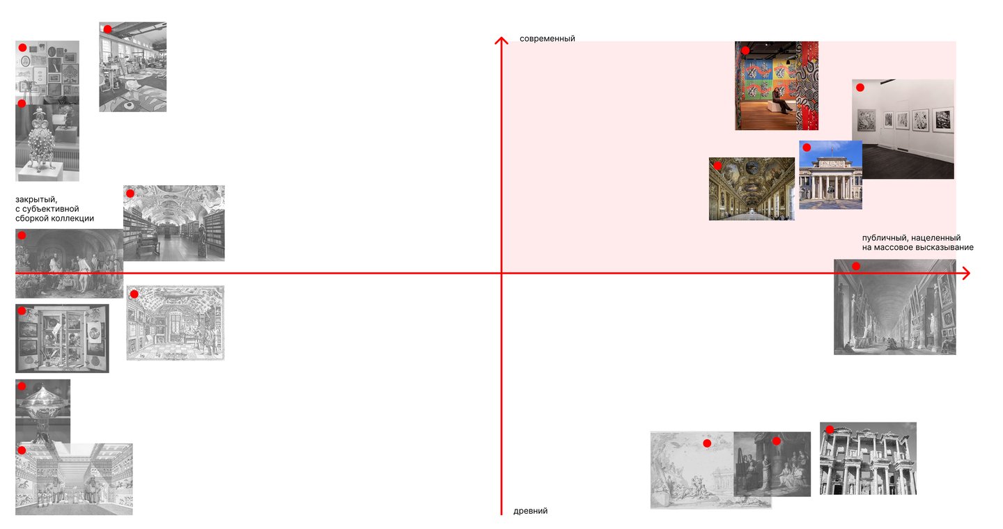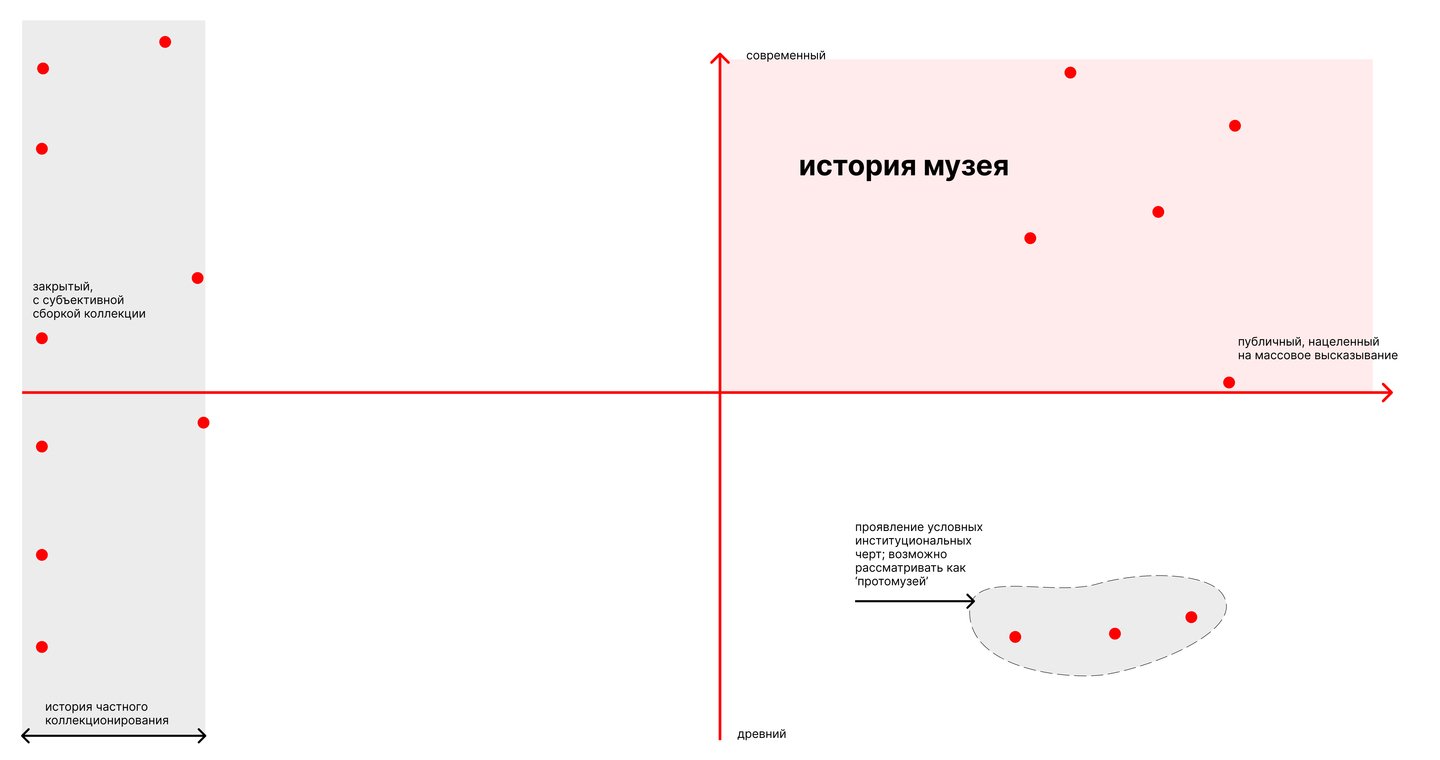 Эта схема представляет собой две координаты: времени и публичности. На них можно располагать любые предметные собрания, которые интуитивно кажутся необходимыми для разговора об истории музея. В хронологической последовательности среди регулярной и непреложной истории коллекционирования, таким образом, можно обнаруживать проявления социальные, публичные, — и отслеживать их динамику и отличия от реальной музейной институции. Главное, что рамки самой истории музея остаются стабильными, неизменными из-за вполне конкретно определенной точки сложения институции.