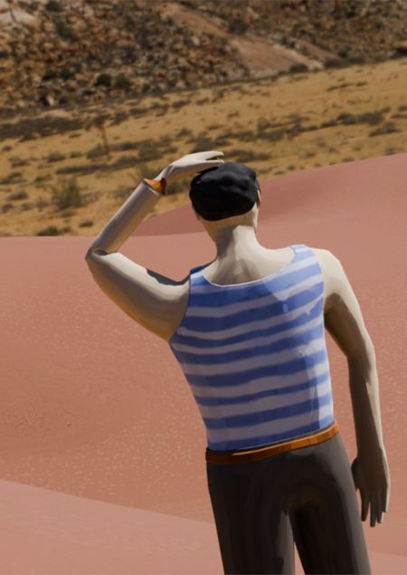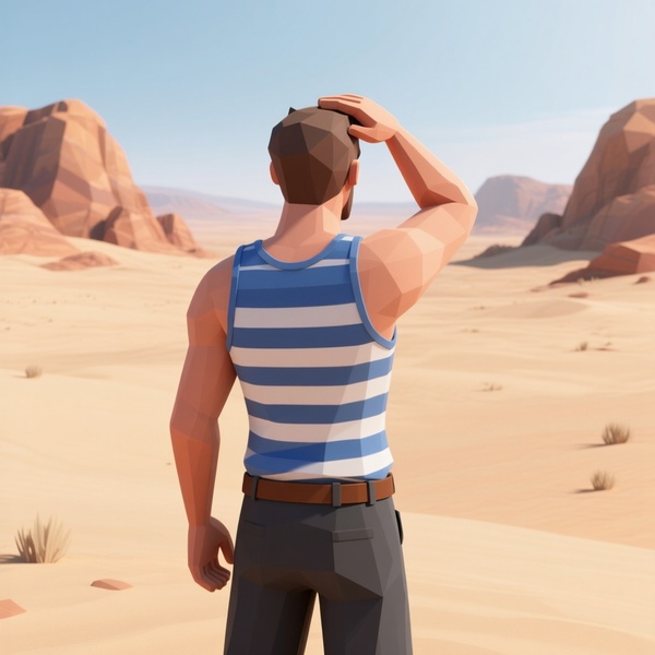 A stylized digital 3D render of a man standing in a desert landscape, viewed from behind. He is wearing a blue and white striped tank top and dark pants, with a brown belt. His right hand is raised to his head as he looks into the distance. The background is a sandy desert with rocky hills in warm tones. The lighting is natural, bright daylight. The art style is semi-realistic, smooth shading, slightly low-poly look.—ar 3:4 —v 5 —style raw —quality 2