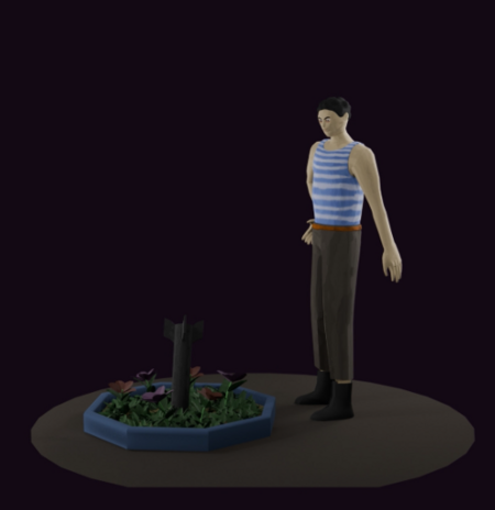 A stylized mid-poly / low-poly 3D digital artwork showing a man standing thoughtfully and solemnly in front of a small rocket planted vertically in a circular or octagonal flowerbed. The rocket is surrounded by green plants and a few flowers, as if it were a symbolic monument. The man has short dark hair and wears a blue and white striped tank top, brown pants with an orange belt, and black shoes. He stands with a slightly slouched posture, looking down at the rocket with a calm, melancholic expression. The background is minimal and dark purple, creating a dramatic and emotional contrast with the soft lighting that highlights the figure and the rocket. The mood is introspective, surreal, and symbolic — suggesting reflection, memory, or loss.