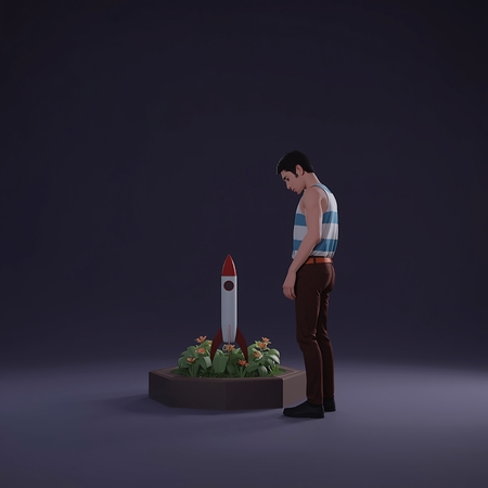 Style: mid-poly / low-poly hybrid, stylized realism Lighting: soft, directional, cinematic, subtle shadows Color palette: dark muted tones with soft contrast Composition: centered or three-quarter view, full-body character facing the rocket Mood: surreal, quiet, reflective, emotional symbolism