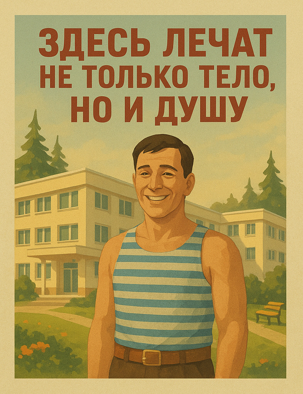 Style: mid-poly / low-poly stylized realism Lighting: soft morning or late afternoon sunlight, warm tones, long shadows Color palette: warm white, pale yellow, light blue, soft green, natural wood Mood: peaceful, optimistic, therapeutic, nostalgic Soviet atmosphere Details: pine forest, benches, garden paths, blooming flowers, wide balconies, large windows, flags or health posters, clean building facade