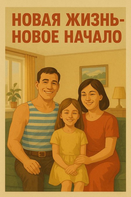 A vintage Soviet-style propaganda poster from the 1960s, in warm tones and Socialist Realism style. Inside a cozy Soviet apartment, a happy family — a man, a woman, and a child — smiling and embracing each other. The room feels peaceful and full of light, with books, flowers, and sunlight streaming through the window. The atmosphere is hopeful and inspiring, symbolizing healing and a return to normal life after hardship. On the wall, a large slogan reads: «New Life — New Beginning!». The composition should feel emotional, optimistic, and full of warmth.