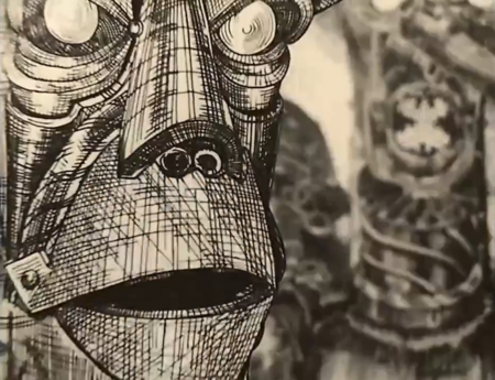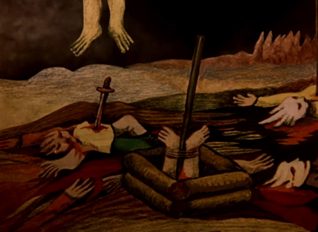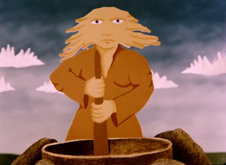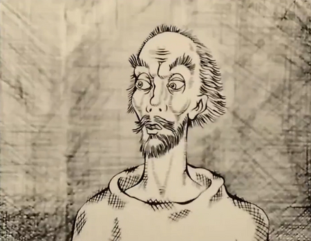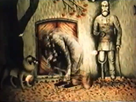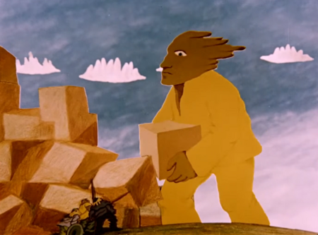 Особенно трагична статика героя — сам дизайн персонажей Рейна Раамата располагает к тому, чтобы благодаря эффекту Кулешова увидеть в неподвижном лице великана внутреннюю стойкость и смирение перед судьбой.