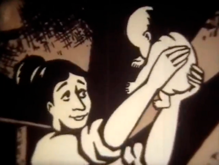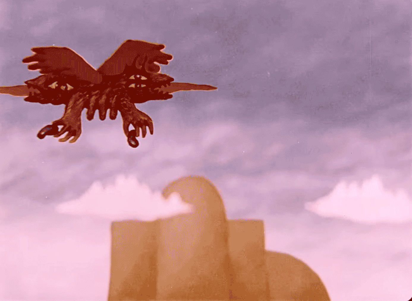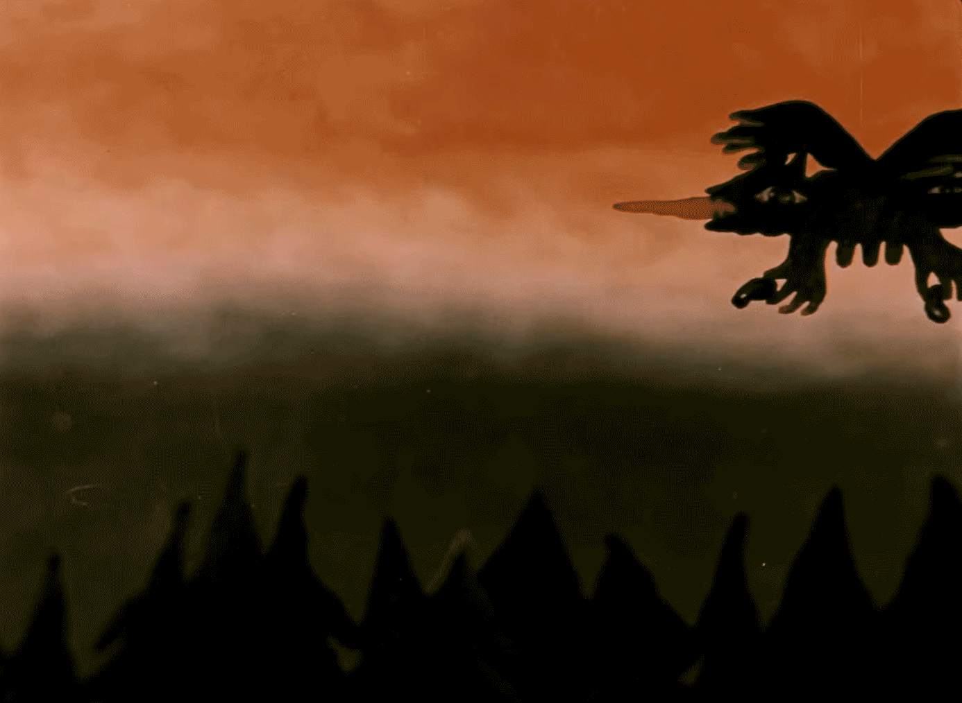 Примечательно, как на монтажном уровне разделены эпизоды мира и войны через повторяющиеся кадры с пролетом страшного животного, похожего на чертенка.