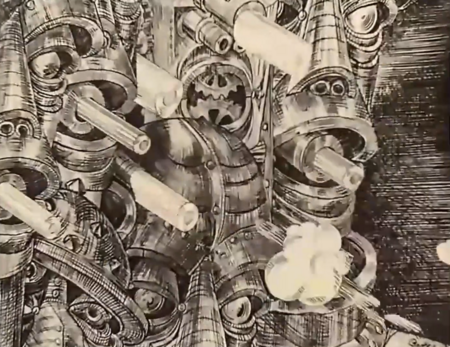 Один из конфликтов в творчестве Рейна Раамата прослеживается из работы в работу, при этом не являясь основным в его творчестве — это противостояние уродливой техногенной современности и человека, как существа предельно уязвимого перед лицом новой механизированной реальности. Так, в фильме «Ад» под дудку крысолова-заклинателя вырастают механические истуканы, которые, подобно военной технике, стреляют по толпе людей.