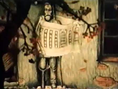 Неподвижный образ деревянной статуи в фильме «Нищий» еще более наглядно отражает эту идею — будучи единственной человеческой фигурой в кадре, которая как-то помогает животным, пусть даже фактом своего существования, зритель проецирует на нищего человеческие качества. Интонационно данный фильм можно назвать предельно сентиментальным. [2]