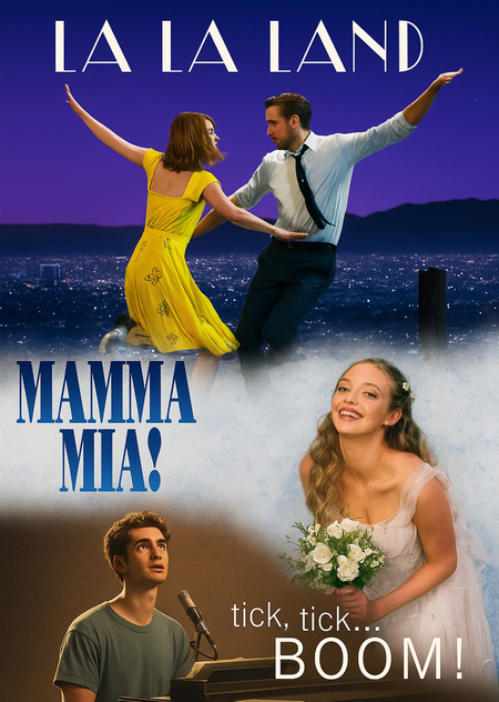 Постеры фильмов: 1 — «Мамма MIA!», 2 — «Шаг вперёд 3», 3 — «Ла-Ла Ленд», 4 — «Mamma Mia!2», 5 — «Шаг за шагом», 6 — «Тик-так… БУМ!», 7 — «Вестсайдская история»