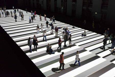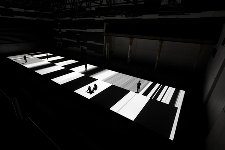 Zimoun. Untitled. 2015. Кинетическая звуковая инсталляция в Knockdown Center (Нью-Йорк). 250 малых электродвигателей и подвешенные деревянные рейки образуют динамическую скульптуру: за счёт трения возникает плотное ритмическое звуковое поле. Другой подход — чисто физическая материализация звука. Швейцарский художник Zimoun создаёт монументальные инсталляции из простых механических элементов: сотни двигателей приводят в движение ниточки, рейки, картон и т. п., порождая сложные шумовые и перкуссионные текстуры.