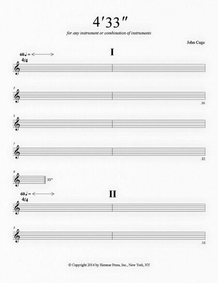 John Cage. 4’33’’ (партитура в виде таймингов), 1952 Схема партитуры, где отсутствуют ноты — ключевой жест в истории саунд-арта.