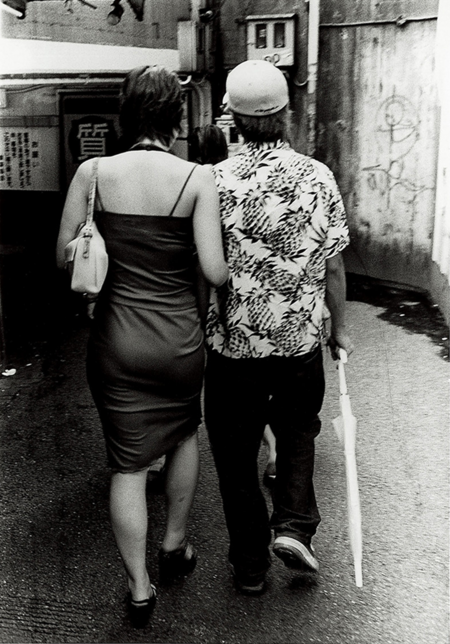 Несмотря на то что сцена была постановочной, снимок демонстрирует способность фотографа «поймать» момент: контраст романтической пары в центре и поток случайных прохожих вокруг создаёт ощущение реального уличного движения. Непредсказуемые позы людей, их траектории и жесты формируют динамическое окружение, благодаря которому даже инсценированная сцена воспринимается как спонтанный момент городской жизни.