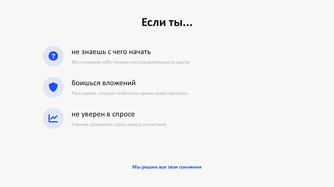 • давно думаешь о своей точке, но не понимаешь, с чего стартовать • боишься вложить деньги в то, что не взлетит • не уверен, что на твой продукт есть спрос • хочешь реальный план действий, а не общие советы