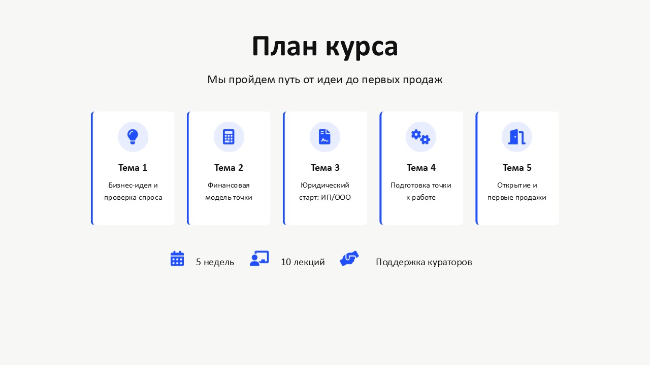Курс идёт 5 недель — каждая неделя закрывает одну большую задачу предпринимателя
