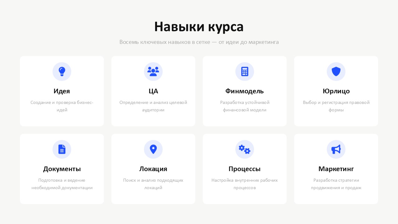 Курс даёт 8 ключевых компетенций для владельца точки. Они не «про теорию», а про твою реальную сборку