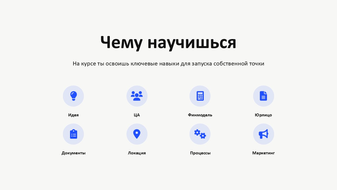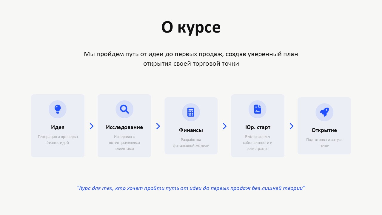 Это практический курс о запуске своей первой точки общепита/ритейла. Ты пройдёшь короткий, но полный путь предпринимателя: от идеи — до первых продаж.